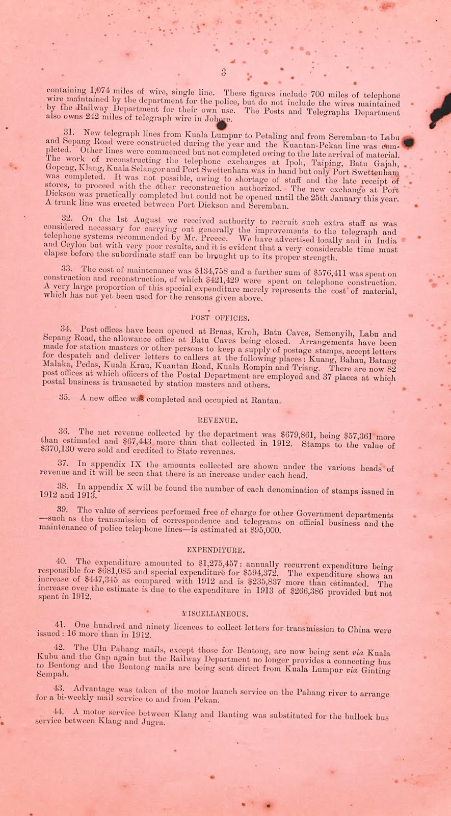 Laporan terperinci Pos dan Telegraf  1913 dalam Laporan Government Gazzette 1914